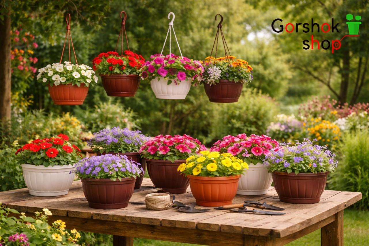 В продажі доступні розміри й кольори - від компактних до більших, у класичних білих або теракотових відтінках; підходять майже для будь-яких ампельних чи декоративних рослин.